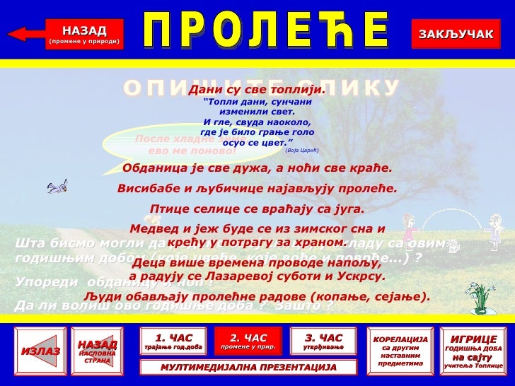 Сада отворите своје уџбенике на страни 94. Погледај добро слике у уџбенику, прочитај текст и запамти важне промене за време годишњих доба. Затим отвори радну свеску на страни 61. и 62. и уради понуђене задатке.